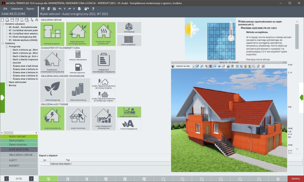 - Edytor graficzny TERMOCADIA: Wbudowany edytor graficzny pozwala na modelowanie bryły budynku bezpośrednio w programie. Obsługuje import rysunków DWG oraz wymianę projektów z systemem ArCADia BIM.