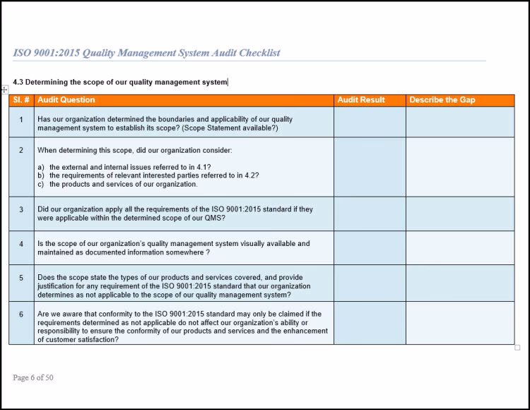 ISO 9001 REQUIREMENTSClauses 0 to 3: Introduction, Scope, References, Terms and Definitions.Clause 4: Context of the organization.Clause 5: Leadership and commitment.Clause 6: Planning for the QMS.Clause 7: Support & resource management.Clause 8: Operational planning and control.Clause 9: Performance evaluation.