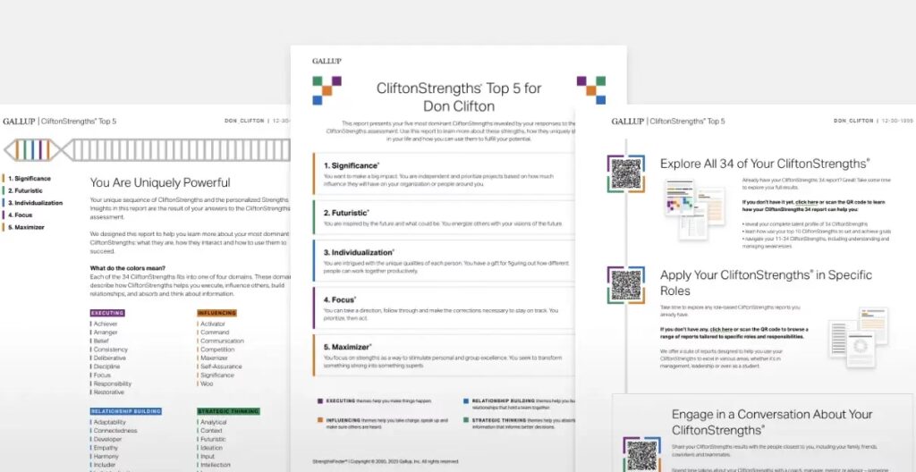 Dogłębne zrozumienie każdego z 34 talentów wymaga dalszej eksploracji. Po wykonaniu testu Gallupa otrzymasz szczegółowy raport, który opisuje Twoje talenty. Możesz również skorzystać ze wsparcia certyfikowanych trenerów metody CliftonStrengths, którzy pomogą Ci zinterpretować wyniki i zaplanować dalszy rozwój.