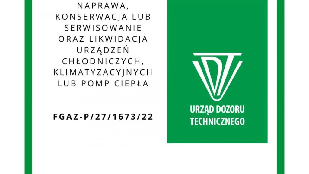 Certyfikat wydawany jest przez Urząd Dozoru Technicznego (UDT) i potwierdza, że przedsiębiorstwo posiada odpowiednią wiedzę, personel, wyposażenie techniczne oraz procedury, aby bezpiecznie i zgodnie z przepisami obchodzić się z urządzeniami zawierającymi F-gazy i SZWO. Bezterminowy certyfikat UDT jest gwarancją legalności i profesjonalizmu Twojej firmy w branży.