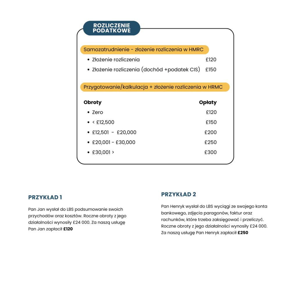 | Prowadzenie ksiąg rachunkowych firmy | £60 - £600 (w zależności od rocznego obrotu i pakietów usług) |
