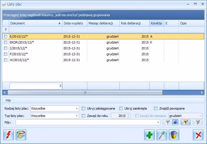 Listę płac można usunąć tylko wtedy, gdy znajduje się ona w buforze i nie ma na niej policzonych żadnych wypłat. Listy płac w buforze są wyświetlane na zielono, natomiast listy zamknięte (zablokowane przed zmianami) są wyświetlane na czarno. List zamkniętych nie można bezpośrednio usunąć.