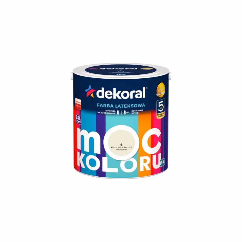 - Dekoral Moc Koloru: Farba lateksowa dostępna w szerokiej gamie kolorów. Podobnie jak Akrylit W, charakteryzuje się wysoką wydajnością i odpornością na szorowanie. Dostępna w atrakcyjnych, nasyconych odcieniach.