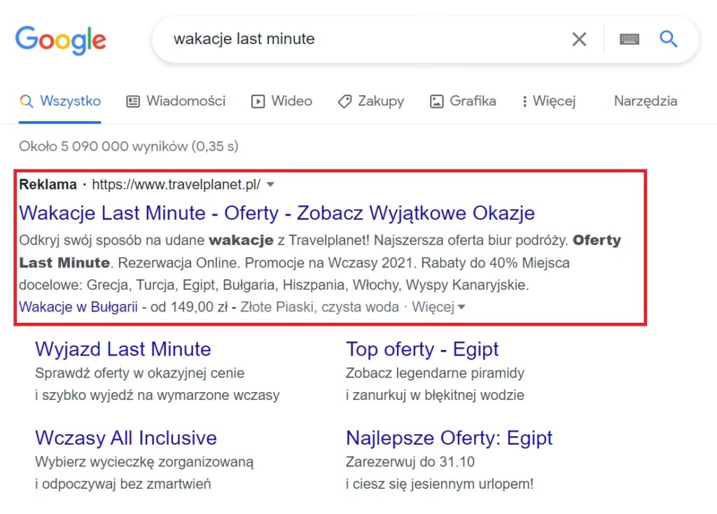 (Rysunek 7 Przykład reklamy Google Ads w wyszukiwarce Google po wpisaniu frazy "wakacje last minute")