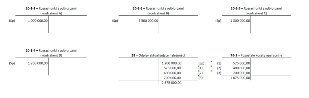 Debet: Koszty z tytułu odpisów aktualizujących należności 10 000 PLN Kredyt: Odpisy aktualizujące należności 10 000 PLN Później, gdy firma „Alfa” ostatecznie spisze należność jako nieściągalną: