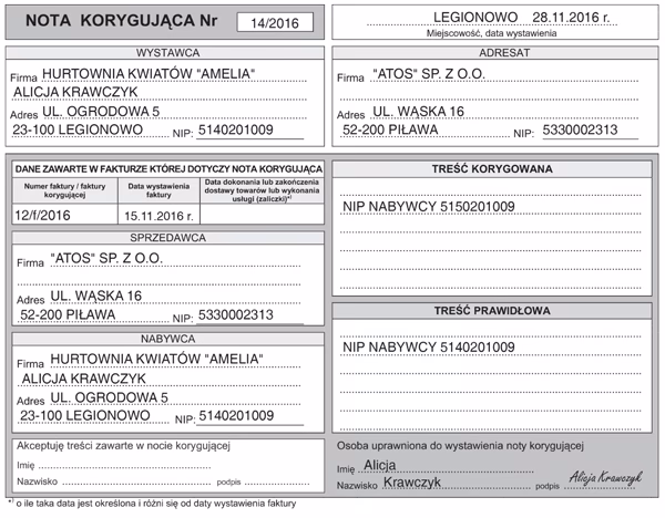 Zatem, nota korygująca idealnie nadaje się do poprawiania błędów w danych identyfikacyjnych nabywcy, takich jak: