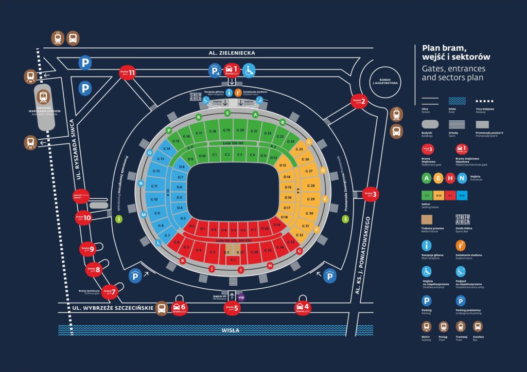 PGE Narodowy to znacznie więcej niż tylko stadion piłkarski. Jego konstrukcja i wyposażenie zostały zaprojektowane z myślą o wielofunkcyjności. Na trybunach stadionu może zasiąść ponad 58 tysięcy kibiców, a podczas koncertów arena jest w stanie pomieścić nawet 80 tysięcy osób. Dla najbardziej wymagających gości przygotowano 62 loże VIP, zapewniające komfort i ekskluzywność. Stadion jest w pełni dostosowany do potrzeb osób z niepełnosprawnościami, co podkreśla jego nowoczesny i inkluzywny charakter.