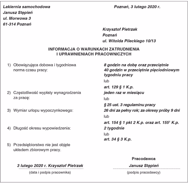 Kto podpisuje informację o warunkach zatrudnienia?