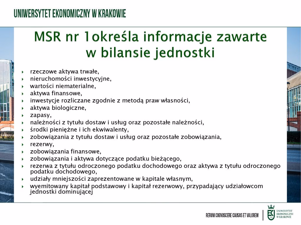 MSR 1 definiuje kompletny zestaw sprawozdań finansowych, który obejmuje następujące elementy: