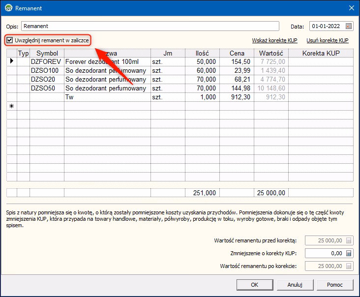 - W tabeli „Pozycje remanentu” należy sprawdzić i ewentualnie zmodyfikować ilości i ceny poszczególnych towarów lub materiałów. Można również dodawać nowe pozycje, które zostały ujawnione podczas spisu z natury, a nie były wcześniej zarejestrowane w systemie.