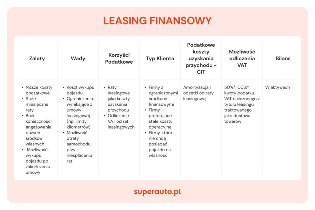 W leasingu finansowym, zwanym także leasingiem kapitałowym lub leasingiem bez wykupu, leasingobiorca amortyzuje przedmiot leasingu i wykazuje go w swoim bilansie jako środek trwały. Ten rodzaj leasingu jest bardziej zbliżony do kredytu inwestycyjnego. Leasing finansowy zakłada, że po spłaceniu wszystkich rat, leasingobiorca stanie się właścicielem przedmiotu leasingu. Nie ma minimalnego okresu trwania umowy, a zobowiązanie można spłacić przed terminem. Kosztem uzyskania przychodów w leasingu finansowym jest jedynie część odsetkowa raty leasingowej oraz odpisy amortyzacyjne.