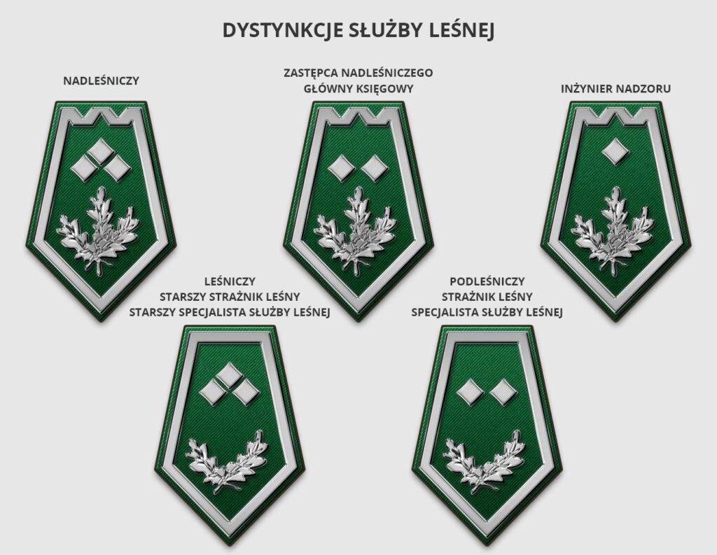 - Szczegółowe informacje można znaleźć w Rozporządzeniu Ministra Środowiska z dnia 6 czerwca 2000 r. w sprawie stanowisk w Służbie Leśnej oraz odpowiadających im stopni służbowych.