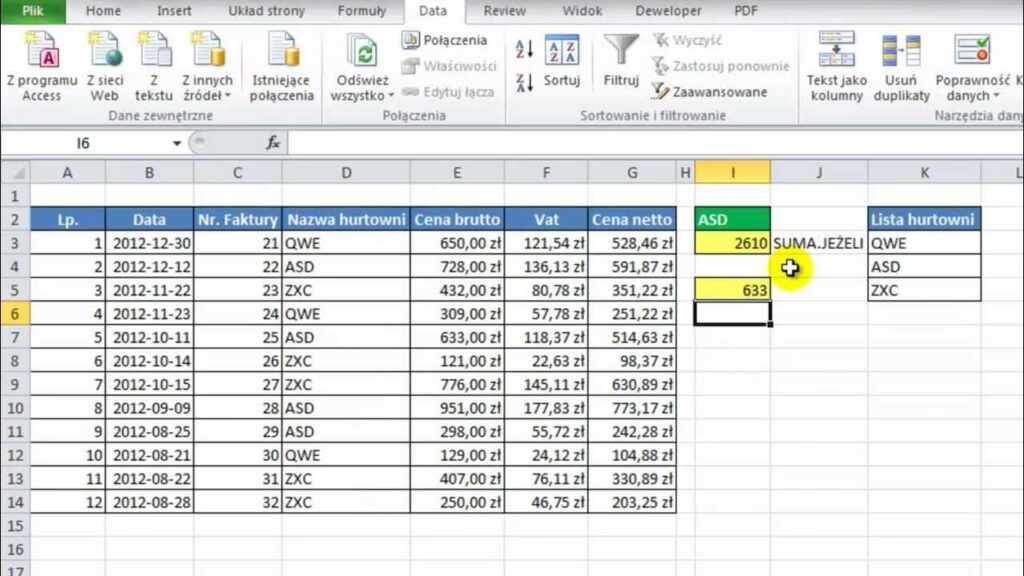 Formuła ta przeszuka kolumnę B w poszukiwaniu "Jan Kowalski", kolumnę A w poszukiwaniu "Laptop" i kolumnę C w poszukiwaniu "Styczeń". Gdy wszystkie trzy warunki zostaną spełnione w danym wierszu, funkcja doda wartość z kolumny D z tego wiersza do sumy końcowej. Wynikiem będzie suma sprzedaży laptopów przez Jana Kowalskiego w styczniu.