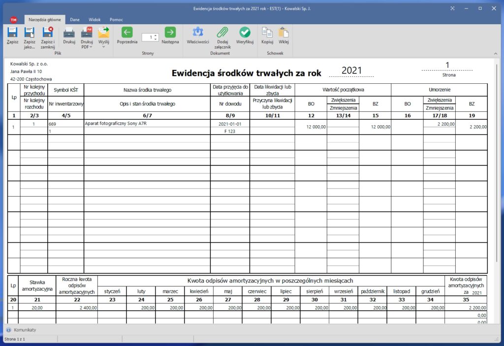- Dokonanie odpisu amortyzacyjnego: W miesiącu przyjęcia środka trwałego do użytkowania, dokonaj jednorazowego odpisu amortyzacyjnego w pełnej wartości początkowej. Odpis ten należy ująć w kosztach uzyskania przychodów.