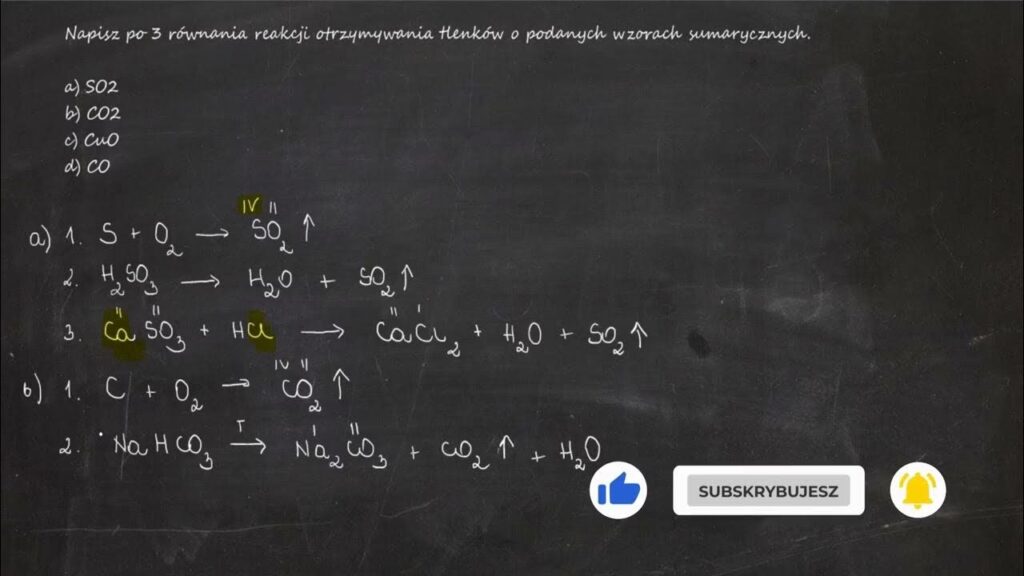 SO2 + 2NaOH → Na2SO3 + H2O - Reakcja tlenku węgla(IV) z wodorotlenkiem wapnia: Tlenek węgla(IV) (CO2) reaguje z wodorotlenkiem wapnia (Ca(OH)2), znanym jako woda wapienna, tworząc węglan wapnia (CaCO3) i wodę. Reakcja ta jest wykorzystywana do wykrywania CO2: