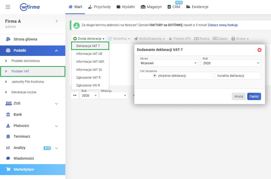 - Przejście do zakładki deklaracji i uruchomienie generowania JPK_V7: Kolejnym krokiem jest odnalezienie w menu systemu księgowego zakładki odpowiedzialnej za deklaracje. Zwykle nosi ona nazwę "Deklaracje" lub podobną. Po przejściu do tej zakładki, należy poszukać opcji umożliwiającej generowanie JPK_V7. Często jest to oznaczony zielonym przyciskiem z napisem "vat (jpk)" lub podobnym. Kliknięcie tego przycisku uruchamia proces generowania pliku.
