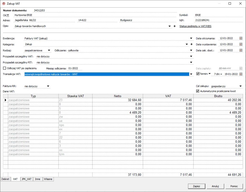 • Deklaracja VAT: Transakcja WNT musi być wykazana w deklaracji VAT (np. VAT-7 lub VAT-7K) oraz, w przypadku zarejestrowania jako podatnik VAT-UE, w informacji podsumowującej VAT-UE.