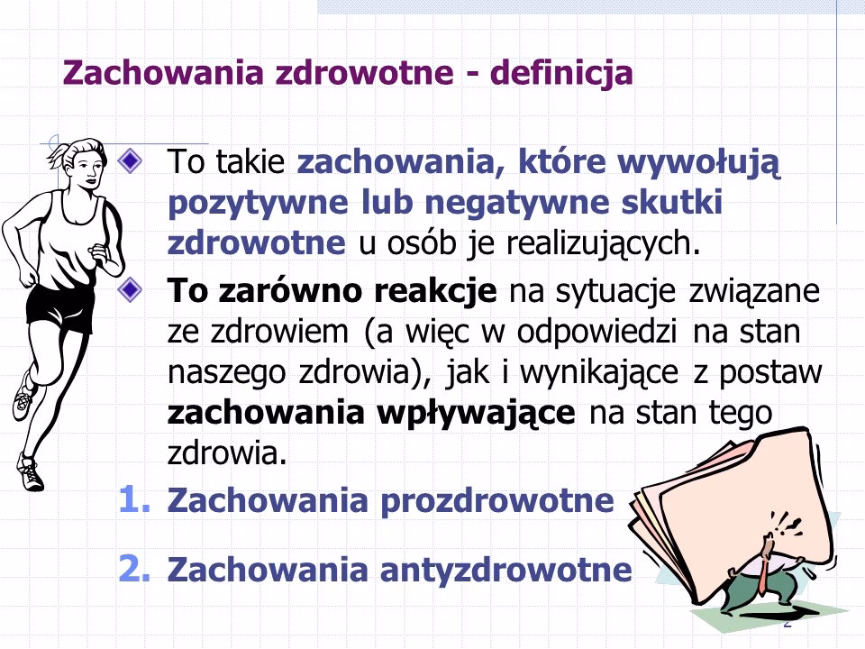in.: racjonalne odżywianie, utrzymywanie czystości ciała i otoczenia, aktywność fizyczna, zachowanie bezpieczeństwa, utrzymanie dobrych relacji między ludźmi, radzenie sobie ze stresem. Drugie- antyzdrowotne-to np.: palenie tytoniu, nadużywanie alkoholu, leków i innych środków uzależniających.26 maj 2020