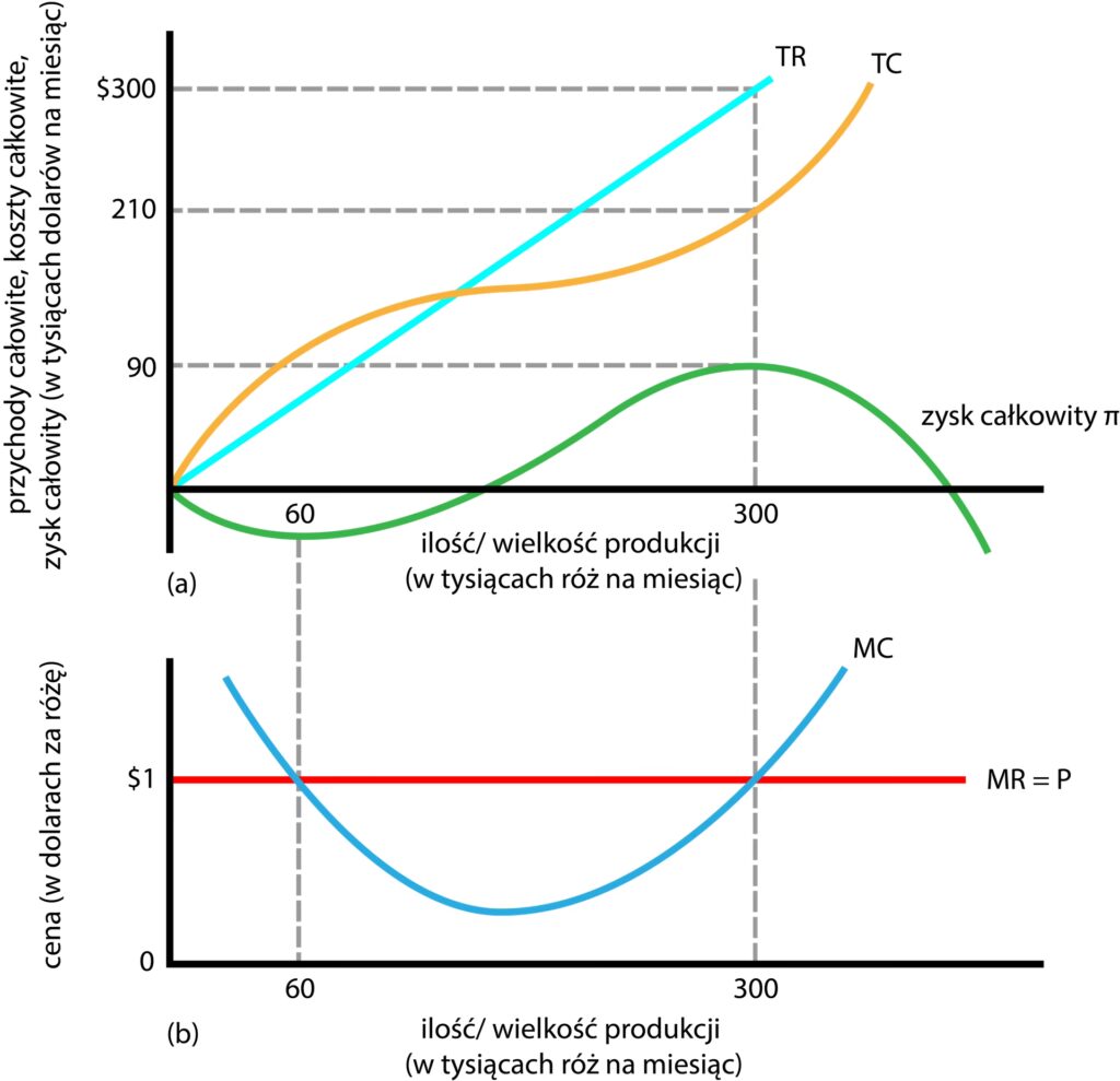 Przedsiębiorstwo maksymalizuje zysk, gdy różnica między przychodami całkowitymi a kosztami całkowitymi jest największa. Można to osiągnąć poprzez analizę krzywych przychodów całkowitych i kosztów całkowitych, a punkt maksymalnego zysku odpowiada największej pionowej odległości między tymi krzywymi.